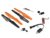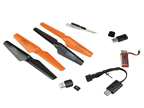 Im Lieferumfang enthalten sind außerdem ein USB-Ladekabel, vier Ersatzrotoren, ein LiPo Akku (7,4 V, 1000 mAh) für die Drohne und ein LiPo Akku (3,7 V, 450 mAh) für die Fernsteuerung. Auch eine Bedienungsanleitung (Deutsch und Englisch) wird mitgeliefert.