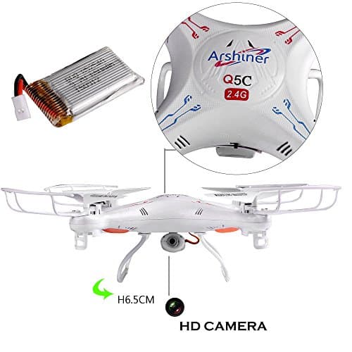 Der Q5C von Arshiner ist in etwa baugleich mit dem Syma X5C und besitzt eine integrierte Kamera. Mit 2 MP sorgt diese für schöne Aufnahmen. Mit dem verbauten 650 mAh LiPo erreichen Sie Flugzeiten von etwa 7 - 8 Minuten und lassen den Arshiner Q5C in einem Umkreis von ca. 50 Metern fliegen.