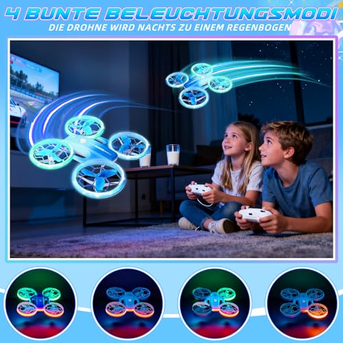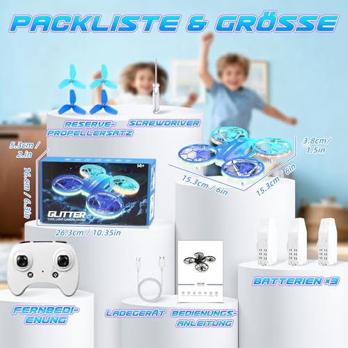 Die Charmofun Mini ist eine robuste Mini-Drohne ohne Kamera für Kinder. Sie wird mit gleich drei Akkus (ca. 10 Min. Flugzeit pro Akku) ausgeliefert, besitzt einen umlaufenden Propellerschutz, eine bunte LED-Beleuchtung und beherrscht Kunststücke wie 360-Flips auf Knopfdruck.