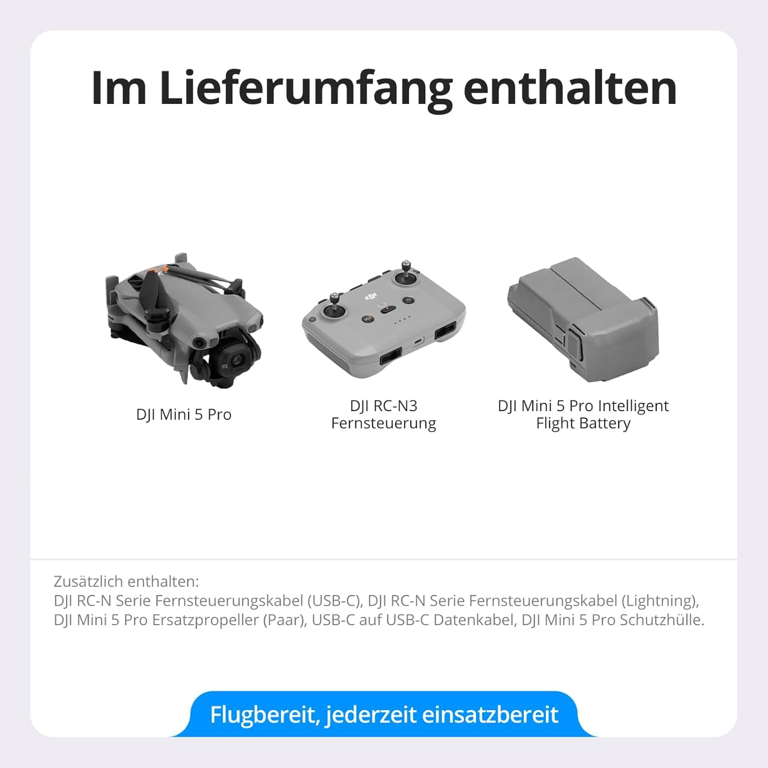 Erhältlich ist die DJI Mini 5 Pro in insgesamt drei unterschiedlichen Ausführungen. Entweder mit der RC-N3 Fernsteuerung (729 € UVP), dem neuen RC-2-Controller (989,99 € UVP) oder als Fly More Combo (mit RC-2-Controller) – für 1.149 € UVP.