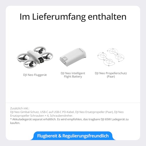 Zertifiziert ist die DJI Neo als Drohne der Drohnenklasse C0. Aufgrund des geringen Gewichts benötigen Sie für die DJI Neo aktuell keinen Drohnenführerschein. Da der Copter aber über eine Kamera verfügt, ist für den ordnungsgemäßen Betrieb in Deutschland neben einer Drohnen-Haftpflichtversicherung auch die Registrierung als Pilot sowie das Anbringen eines feuerfesten Drohnen-Kennzeichens vorgeschrieben. Mehr Informationen zum Thema erhalten Sie in unserem Artikel zur EU-Drohnenverordnung.