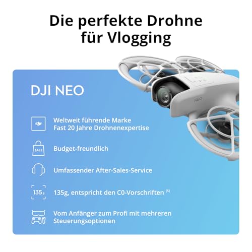 Aufgrund der kompakten und leichten Bauweise sowie der äußerst einfachen Bedienung eignet sich die DJI Neo bestens für den Urlaub, Ausflüge, sportliche Aktivitäten und natürlich auch hervorragend zum Vloggen. Der vielseitige Quadrocopter ist blitzschnell einsetzbar und liefert hochwertige Ergebnisse ohne langes Üben.