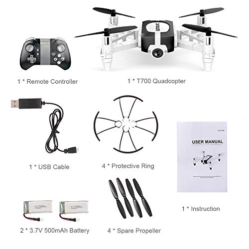 Die GoolRC T700 ist ein preiswerter Mini-Quadrocopter mit HD-Kamera und der Möglichkeit zur FPV-Livebild-Übertragung. Die Drohne eignet sich für Einsteiger und auch Kinder und wird mit gleich zwei Akkus ausgeliefert. Die Flugzeit pro Akku liegt bei ca. 6 bis 10 Minuten.
