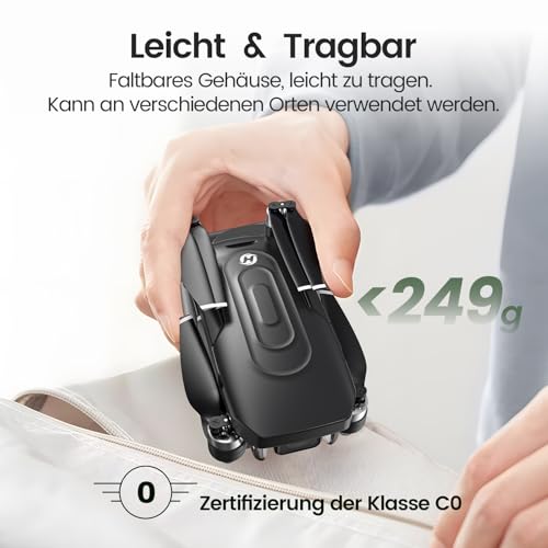 Im flugbereiten Zustand misst die HS175G 33,4 x 23,4 x 6 cm. Das Gewicht beträgt 249 Gramm. Damit wird für die C0-zertifizierte Drohne aktuell kein Drohnenführerschein benötigt. Lediglich die obligatorische Drohnen-Haftpflichtversicherung sowie die Registrierung als Pilot (eID) sind vorgeschrieben.
