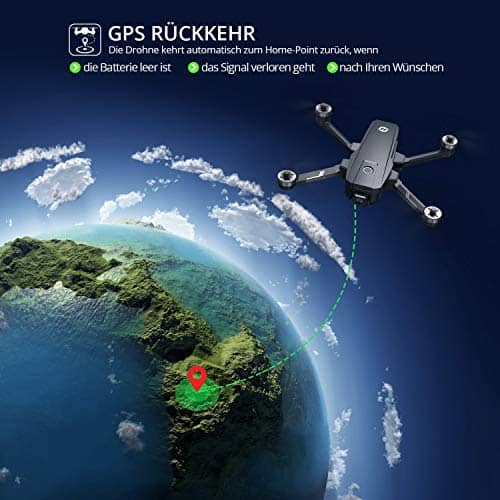 Der Return to Home Modus lässt sich auf Knopfdruck aktivieren und die Drohne eigenständig zur Startposition bzw. zum Landeplatz zurückkehren. Der Modus aktiviert sich übrigens vollautomatisch, sollte der Akkustand zu niedrig werden oder aber das Signal zur Drohne unerwarteter Weise abbrechen. Dies ist ein praktisches Sicherheitsfeature, das dafür sorgen soll, dass Sie die Drohne nicht ausversehen „verlieren“.