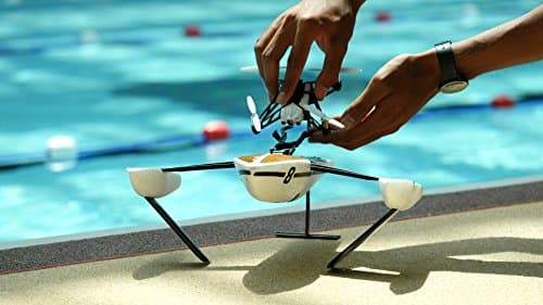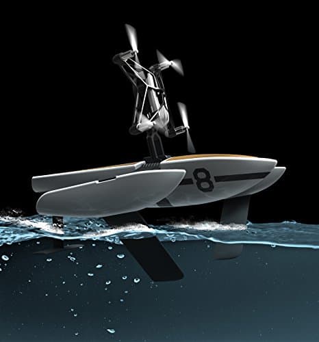 Die Parrot Hydrofoil Drone ist eine Hybrid-Minidrohne für den Einsatz in der Luft als auch zu Wasser. Sie wird entweder als normale Mini-Drohne genutzt oder kann auf einen kleinen Katamaran aufgesteckt werden, um dann als ferngesteuertes Boot zu fungieren.