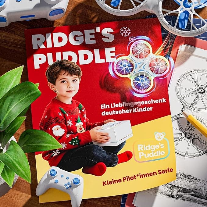 Die Ridge's Puddle Mini-Drohne ist eine interessante Mini-Drohne ohne Kamera, die sich vor allem an Kinder richtet. Sie verfügt über einen umlaufenden Propellerschutz und eine bunte LED-Beleuchtung. Im Lieferumfang sind zwei Akkus enthalten, die jeweils eine Flugzeit von ca. 8 Minuten ermöglichen.