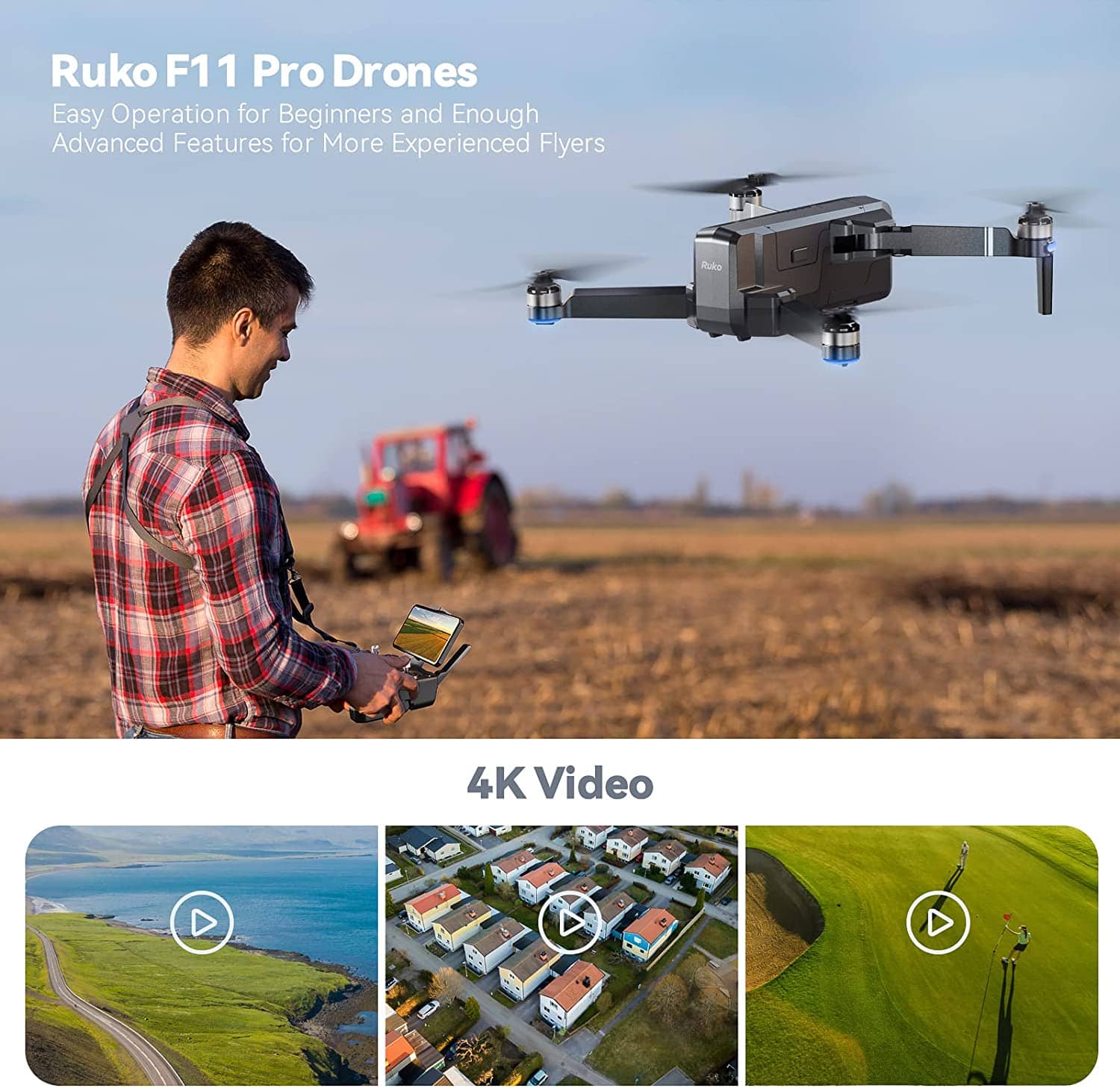 Die Kamera der Ruko F11 Pro nimmt Fotos in 4K (3840 x 2160 Pixel) und Videos in 2,9K (2967 x 1680 Pixel) auf. Die Framerate beträgt 25 fps. Das Blickfeld der Kamera (FOV) liegt bei 120° und ist damit weitwinkelig.