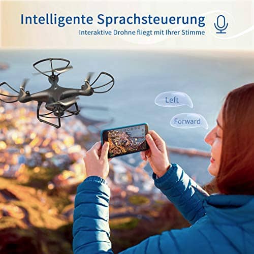 Ein nettes Extra der Snaptain SP 650 ist die verbaute Sprachsteuerung, die allerdings nur auf Englisch funktioniert. Folgende Befehle können ausprobiert werden: Forward, Backward, Left, Right, Take off, Land und Stop.