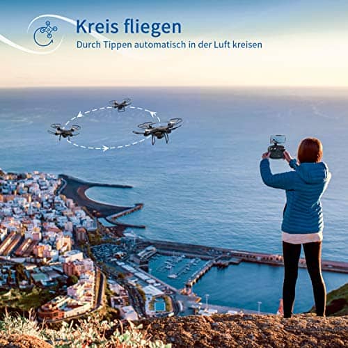 Die verstellbare Full HD Kamera der Drohne macht ordentliche Aufnahmen, auch wenn die Videos aufgrund des fehlenden Gimbals stets etwas verwackelt sein werden. Die Drohne beherrscht 360°-Überschläge, verfügt über eine Sprach- und Gestensteuerung und ist dank Propellerschützern unter Aufsicht auch für Kinder ab ca. 10 Jahren zu empfehlen.